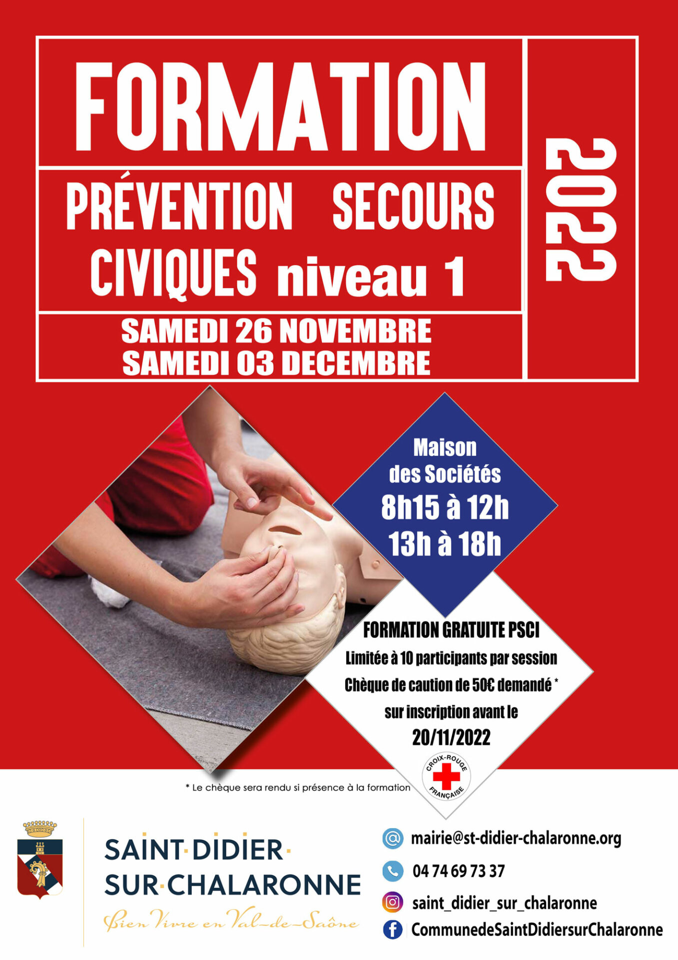 La commune de Saint-Didier-sur-Chalaronne donne la possibilité A TOUS de participer GRATUITEMENT aux formations PSC1 organisées par la Croix Rouge aux dates suivantes :