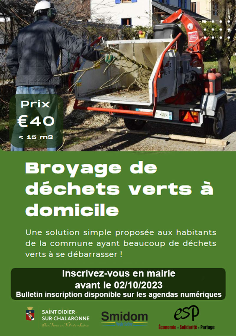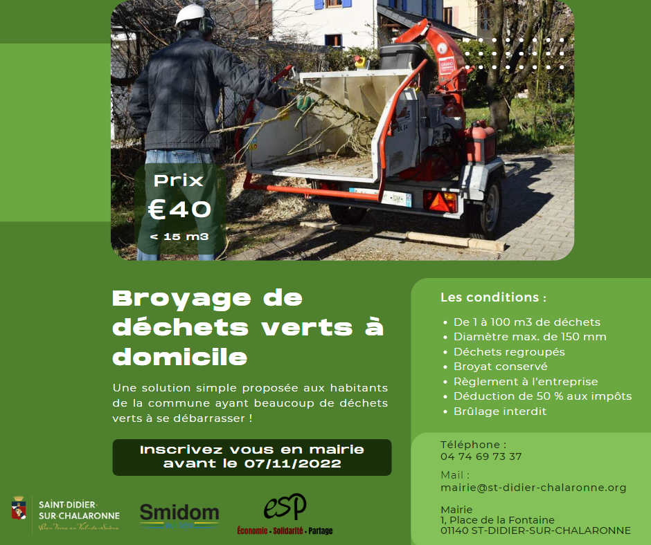 L’association ESP a été mandatée par le SMIDOM VEYLE SAÔNE pour intervenir sur la commune de Saint-Didier-sur-Chalaronne, le lundi 9 novembre 2023 de 9h15 à 12h et de 13h à 16h pour l’opération Broyage de déchets verts à Domicile d’Automne.