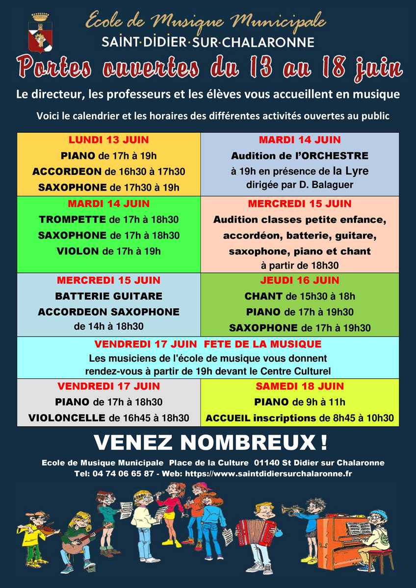 L’école de musique municipale vous accueille dans ses locaux situés au Centre Culturel, Place de la Culture, rue des Huguets, du lundi 13 au samedi 18 juin.