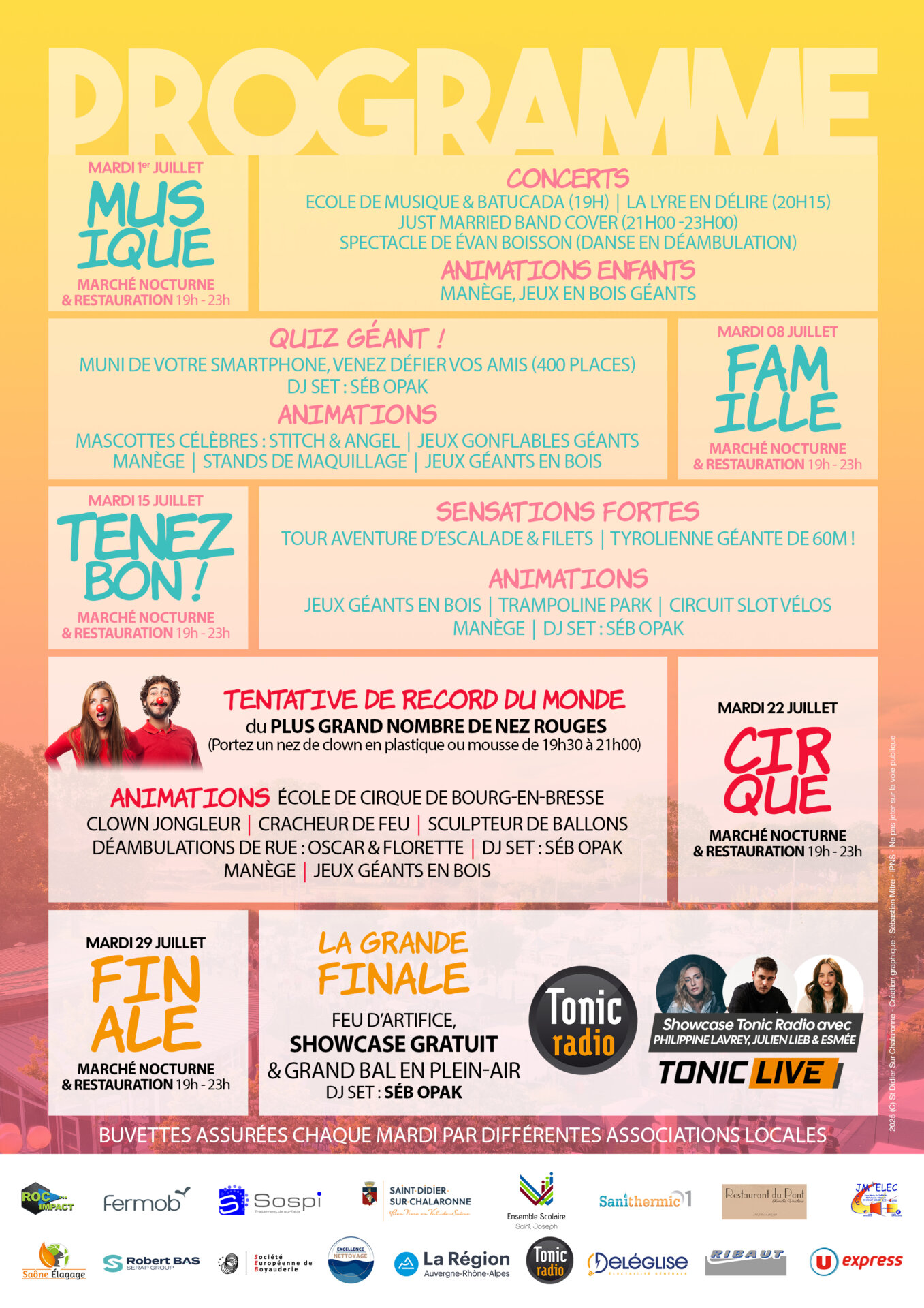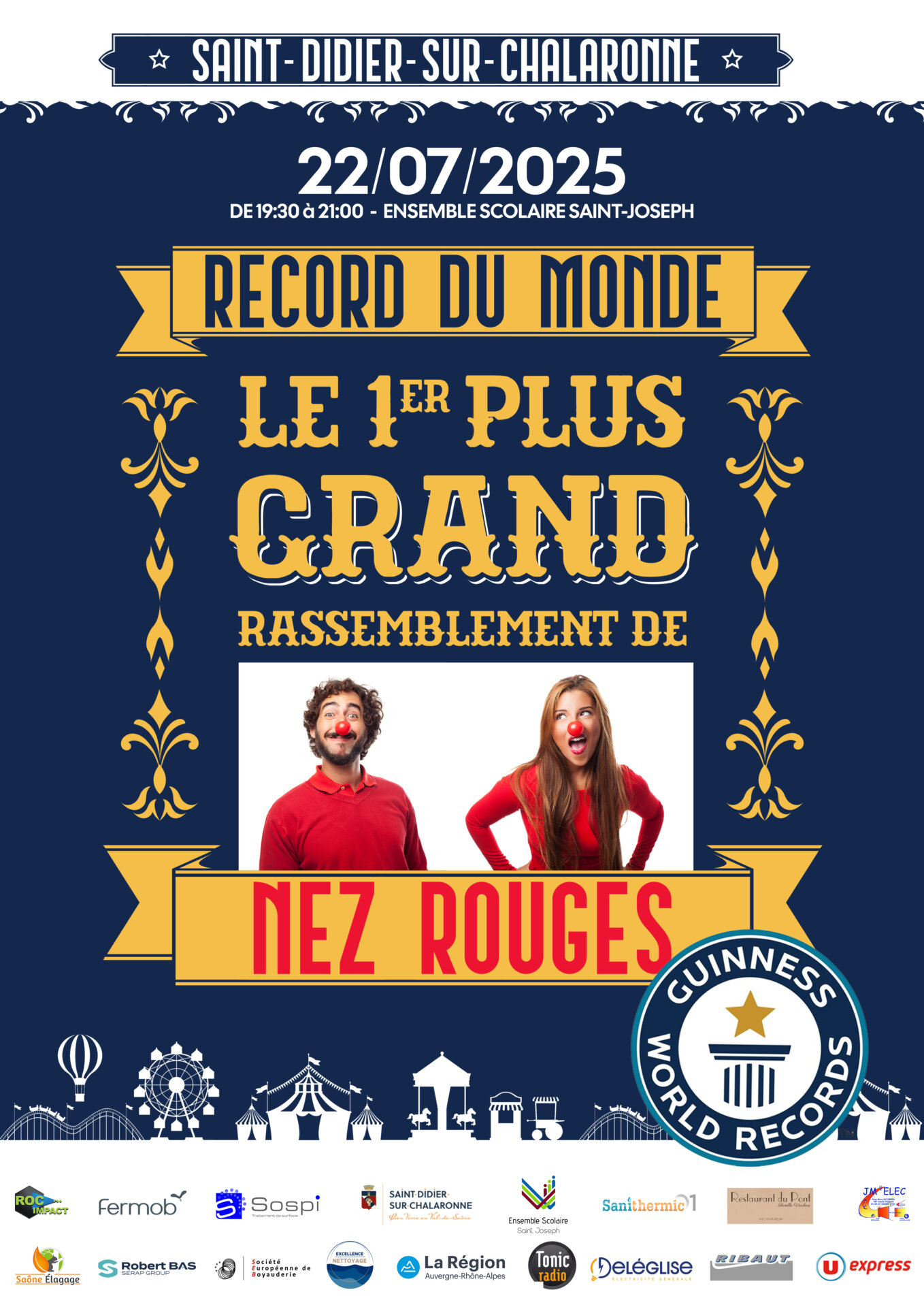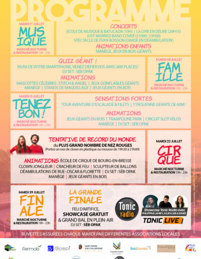 • Règles : Porter un nez de clown (plastique, mousse, etc.) ; Maquillage et Peinture non valide / Comptage des nez rouges entre 19h30 et 21h00