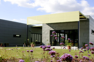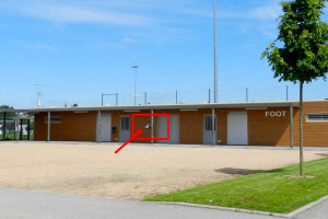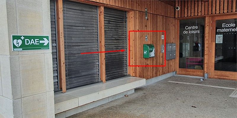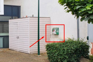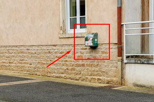 Devant l’entrée principale, à gauche des boîtes aux lettres.